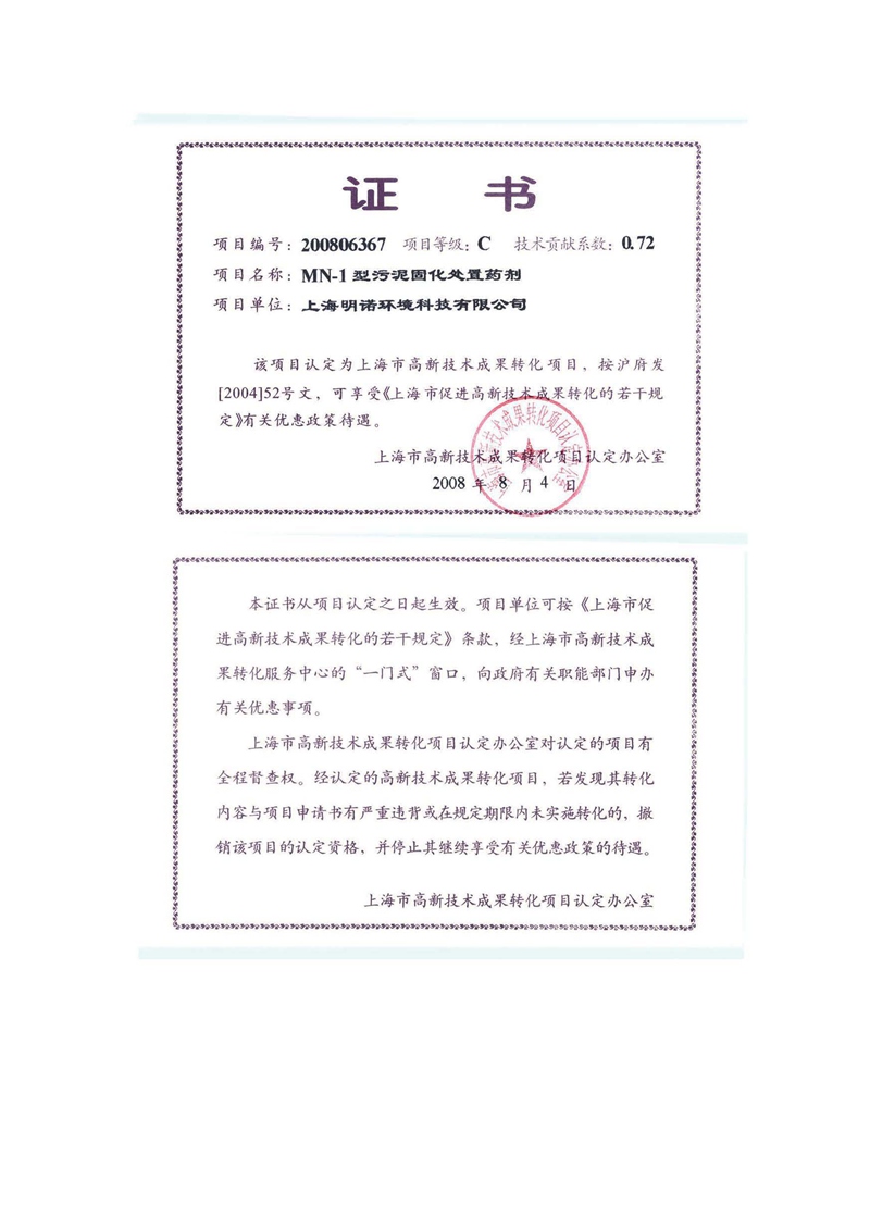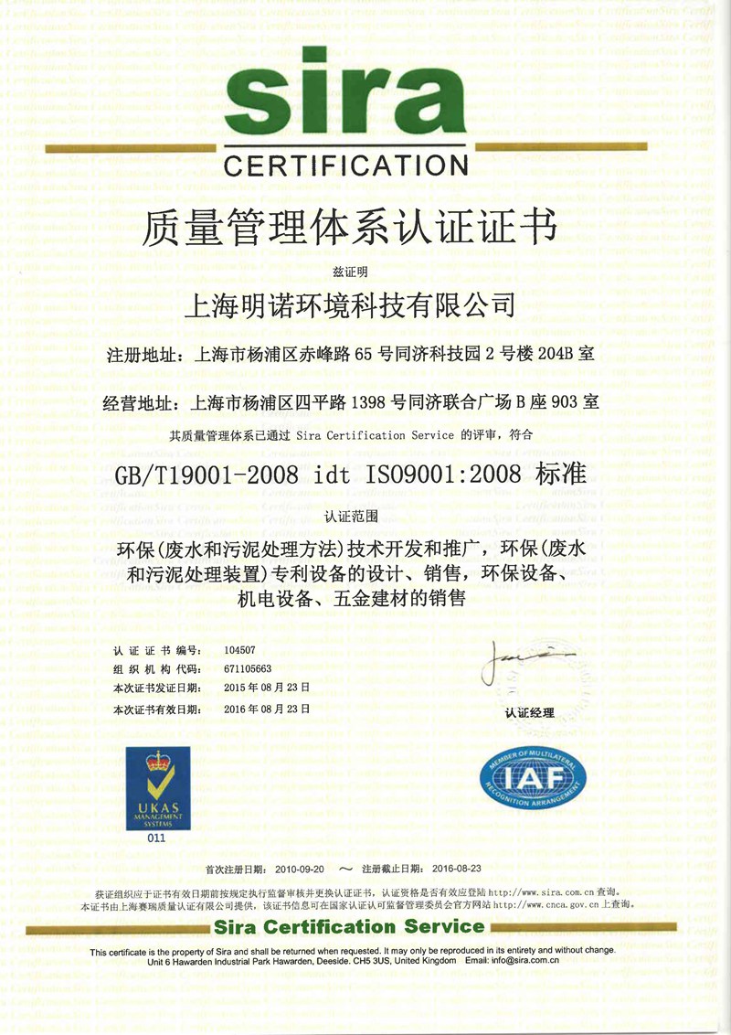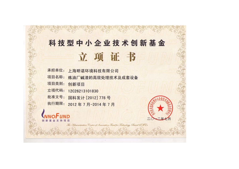 明諾環境被認定為“國家級高新技術企業”,并受到國家科技部創新基金支持。公司已經通過ISO9001:2008質量管理體系認證和ISO14001:2004環境管理體系認證。