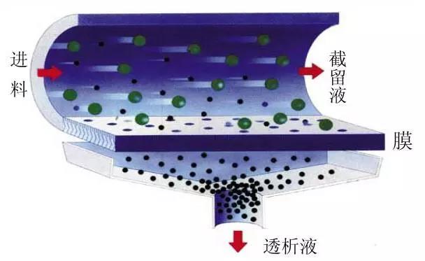 以常見的超濾過程為例,分離機理主要為篩分:膜表面有微孔,流體流經膜一側的表面時,部分較小的分子隨部分溶劑穿過膜到達另一側,形成透析液,而大分子則被截留在原來的一側,形成截留液,從而達到了將大分子溶質與小分子溶質及溶劑分離開的目的。