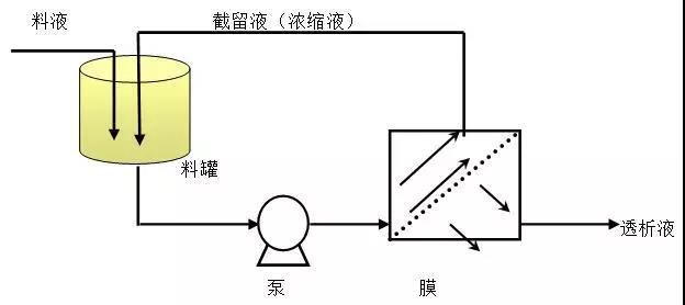 目前常見的膜分離過程以壓差為驅動力、以錯流過濾方式進行,可在常溫下進行分子級的過濾分離,是一種物理過程,其間不發生相變。動力由泵提供,流經膜表面時,部分較小的分子透過膜,而大分子被截留。膜系統組成及基本過濾原理見下圖: