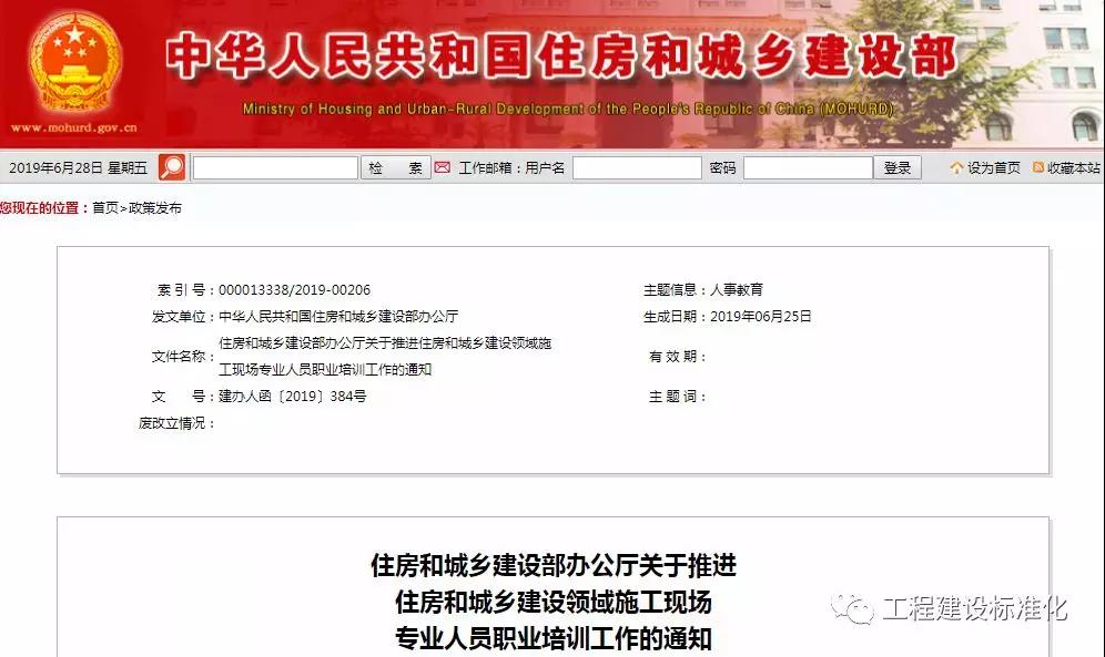 2019年6月28日住建部官網發布《關于推進住房和城鄉建設領域施工現場專業人員職業培訓工作的通知》(建辦人函[2019]384號)。八大員職業培訓工作正式啟動: