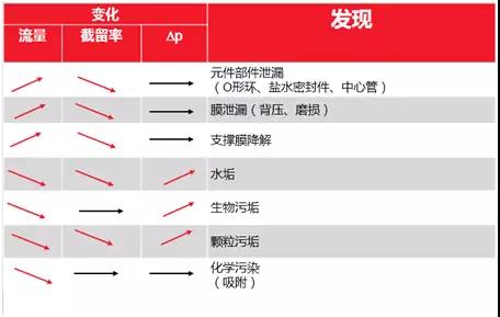 毫無疑問,調(diào)查過程取決于所發(fā)現(xiàn)的問題。如果透鹽率上升,即脫鹽率下降,則表明膜或元件可能出現(xiàn)化學(xué)或機(jī)械損壞。另一方面,滲透流量減少通常是由于有機(jī)、生物或無機(jī)污垢所致。下表概述了過濾性能降低的趨勢(shì)和潛在原因。