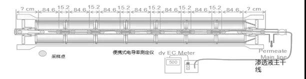 如流量增加而脫鹽率下降,在任何測(cè)量值顯著升高的情況下,應(yīng)檢查所有膜殼的產(chǎn)水電導(dǎo)率。針對(duì)有明顯問題的任何一根管道,可以采用“中心管測(cè)試方法”來識(shí)別哪支膜元件。具體測(cè)試包括將軟管伸入螺旋卷繞元件的中心管,一直到壓力管的末端,然后慢慢地將其拉出,獲取軟管中的部分滲透液。然后對(duì)樣品的電導(dǎo)率進(jìn)行測(cè)試。如果某一點(diǎn)的值突然升高,可根據(jù)已經(jīng)拉出的軟管長(zhǎng)度來確定泄漏的位置。