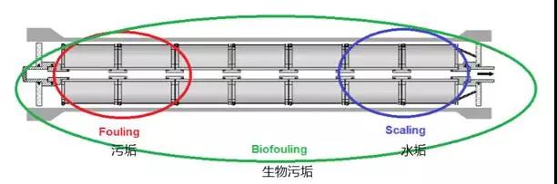 有機(jī)污垢主要導(dǎo)致上游側(cè)管道堵塞,而如果下游側(cè)鹽含量較高,可能導(dǎo)致鹽沉淀,即無機(jī)污垢或水垢。生物污垢可以擴(kuò)散到整個(gè)系統(tǒng),因此可存在于各個(gè)點(diǎn)。